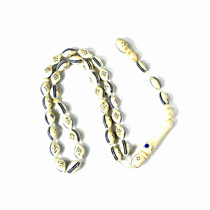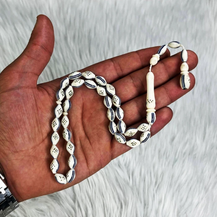 هنر مرصع کاری: تزئینات مرصع کاری (نقطهکوبیها و خطوط ظریف آبی یا مشکی) روی دانهها به صورت دقیق انجام شده است که جلوهای لوکس و منحصر به فرد به تسبیح استخوان شتر میبخشد.